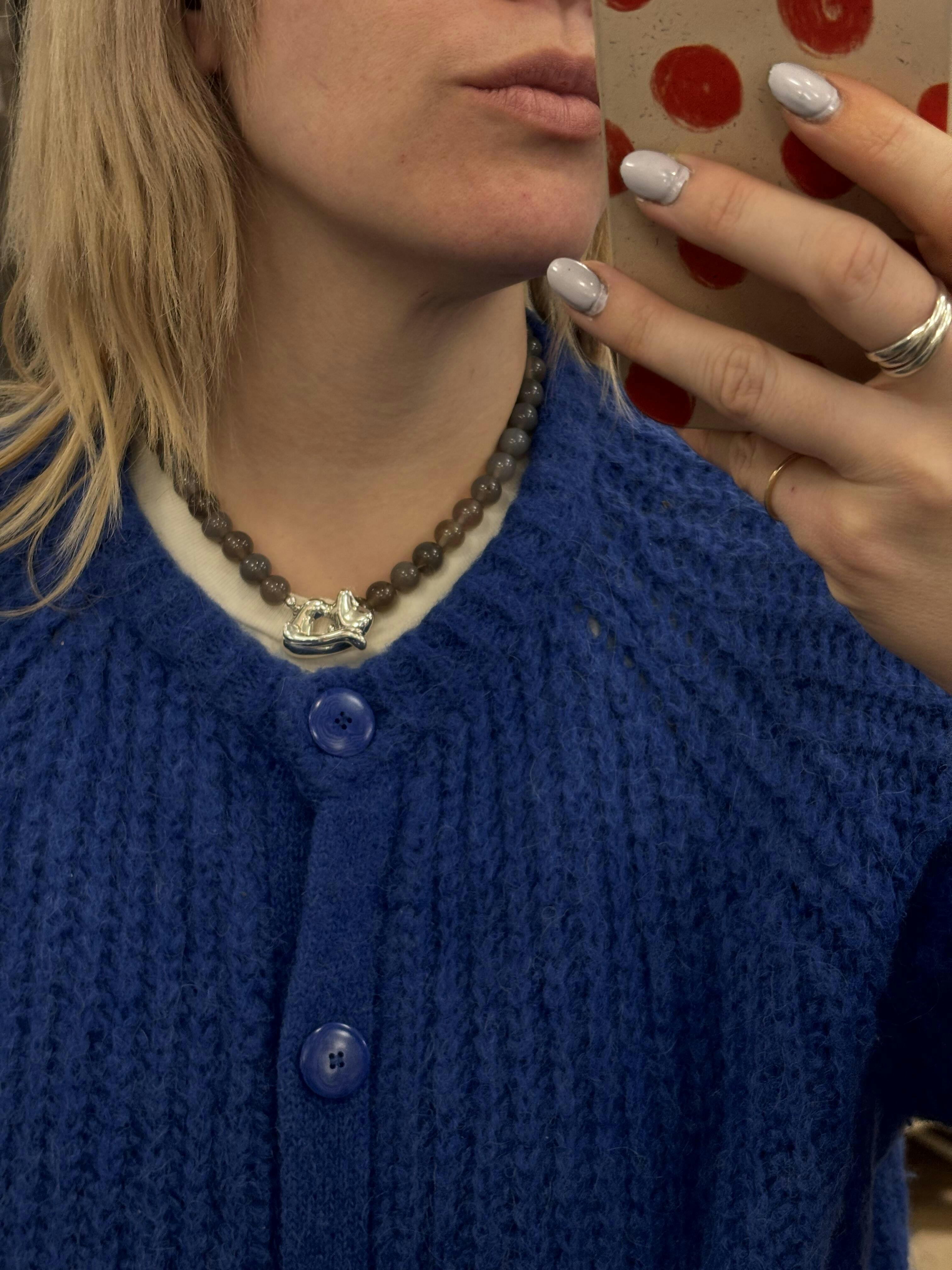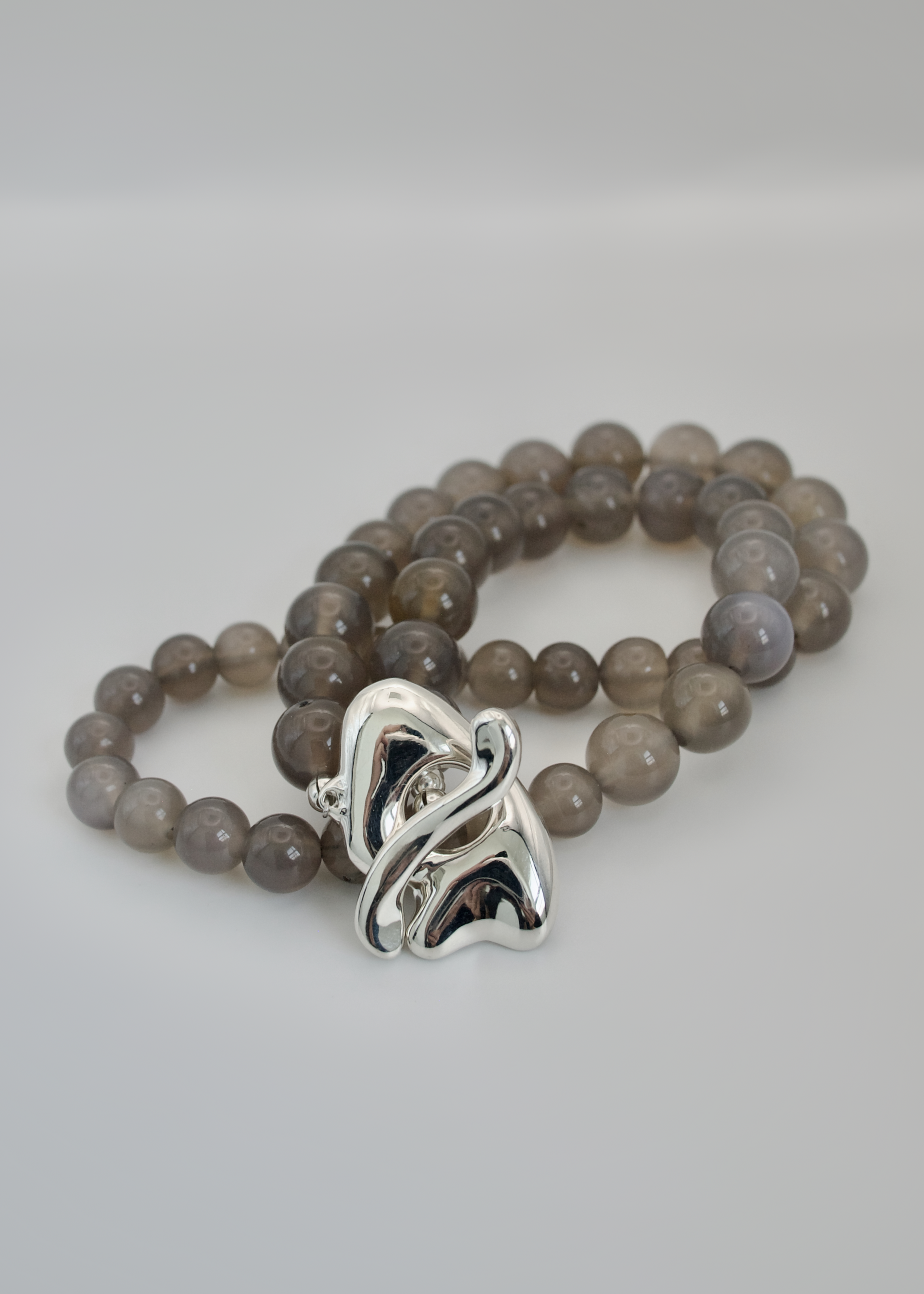 The Runa Pendant showcases a refined combination of polished silver and natural Grey Agate stones, each bead offering unique patterns and subtle elegance.