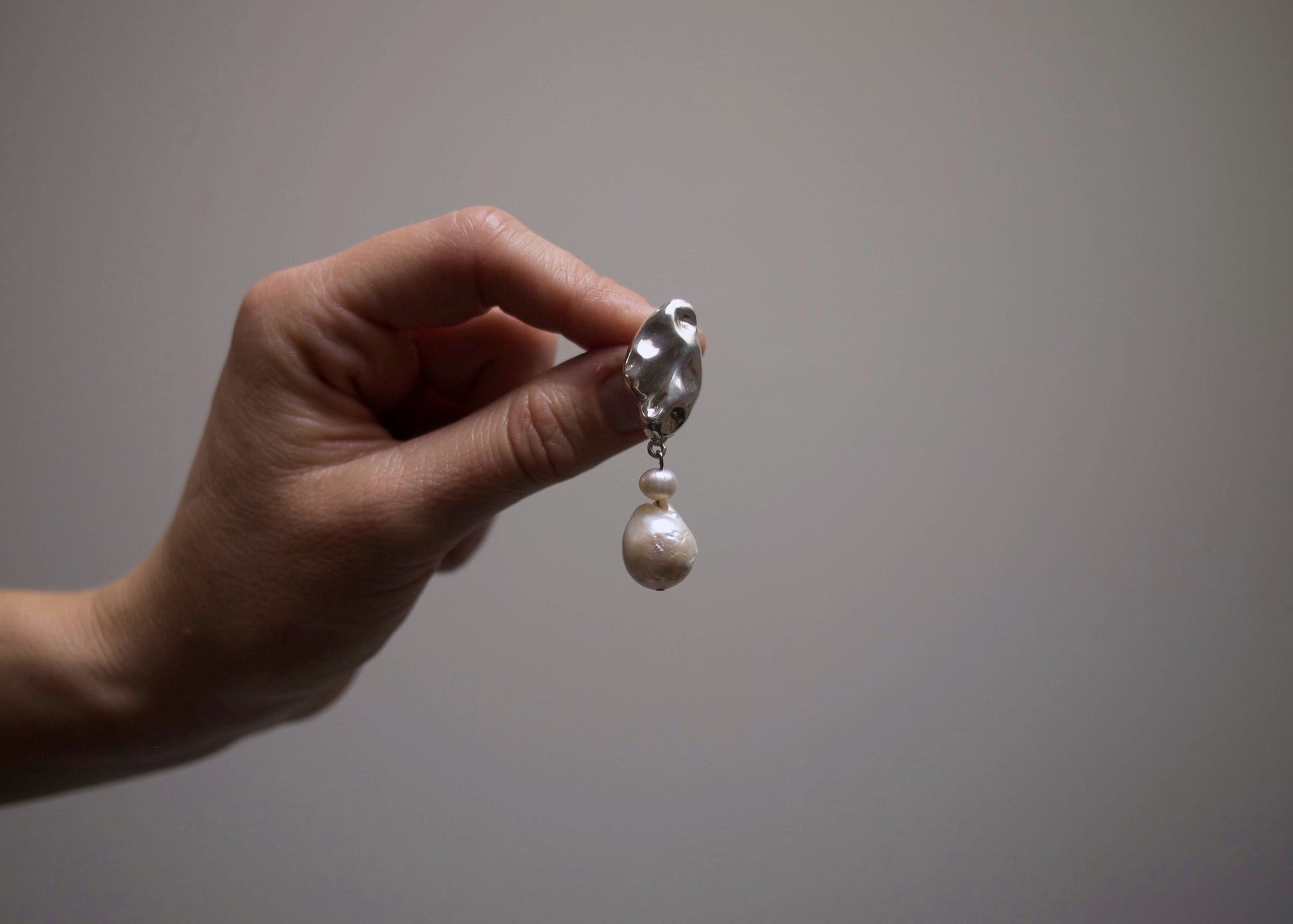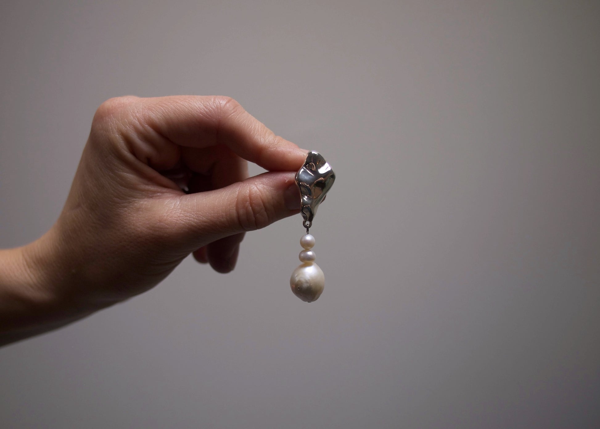 Isabelle Earrings offer a unique fusion of asymmetrical length and aesthetic. Crafted from textured sterling silver, the earrings feature one baroque pearl on each and different amount of medium-sized fresh water pearls.